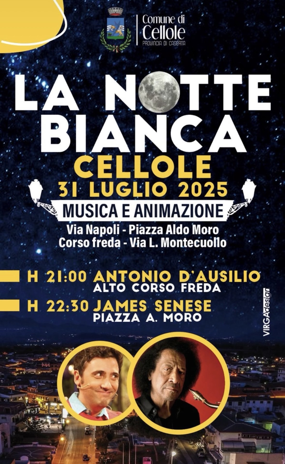 “La Notte Bianca è un appuntamento fisso dell’Estate Cellolese e rappresenta la capacità, della nostra città, di aggregare e divertire” ha dichiarato il Sindaco del Comune di Cellole dott. Guido Di Leone “Siamo entusiasti di offrire ai nostri cittadini e visitatori una serata unica e indimenticabile, con musica, divertimento e tanta creatività.”