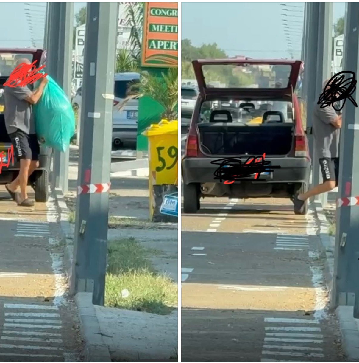 Questo “zozzone” in spregio a qualsiasi regola, violando tra l’altro anche il Codice della Strada, parcheggiando all’interno della pista ciclopedonale, “abbandona” un bustone d’immondizia lungo la strada.