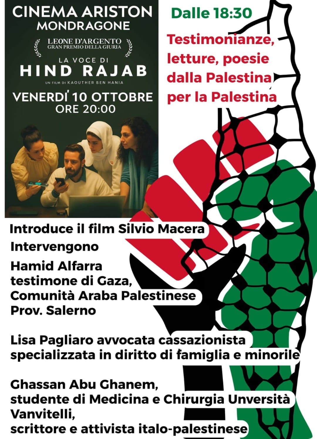 (di Giuseppe Capotosto) Nella serata del 10 ottobre, testimonianze per raccontare il dramma e la resistenza del popolo palestinese al Cinema Ariston di Mondragone, in occasione della proiezione del film “La voce di Hind Rajab” della regista tunisina Kaouther Ben Hania, vincitore del Leone d’Argento, Gran Premio della Giuria alla Mostra del Cinema di Venezia: Il film che racconta la storia reale di una bambina di 6 anni uccisa in un auto colpita da 355 proiettili dall’esercito israeliano.
