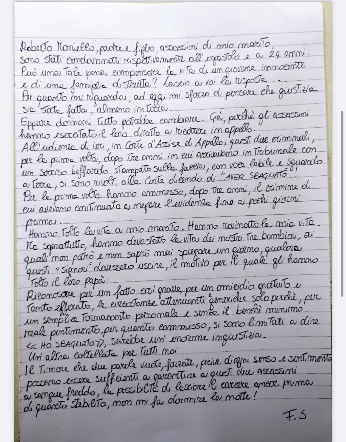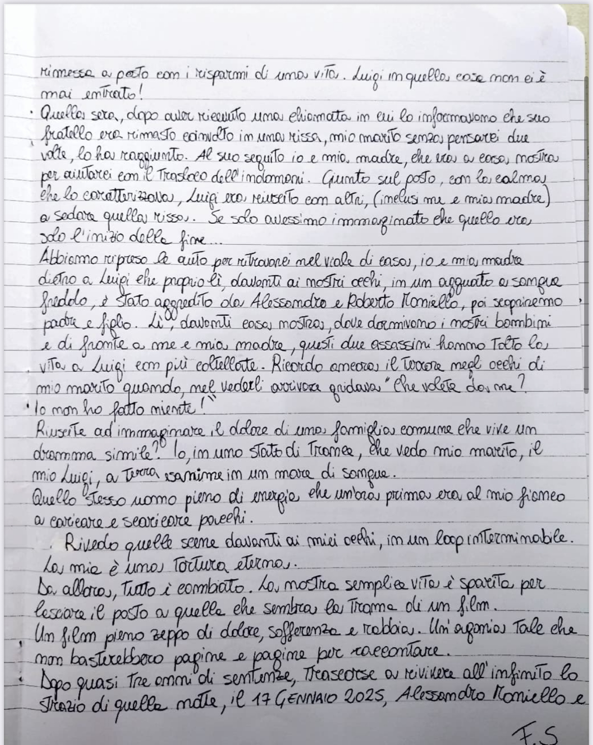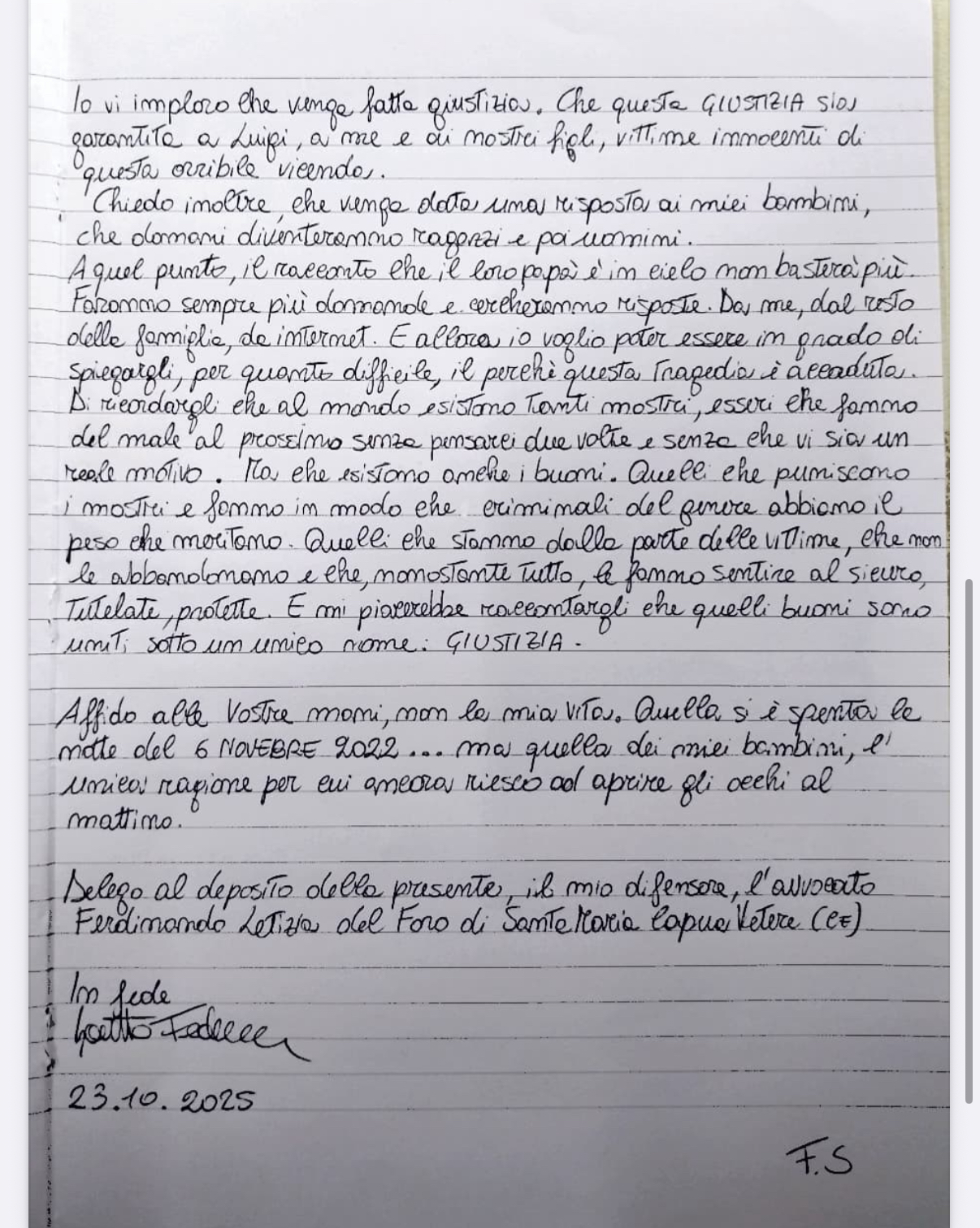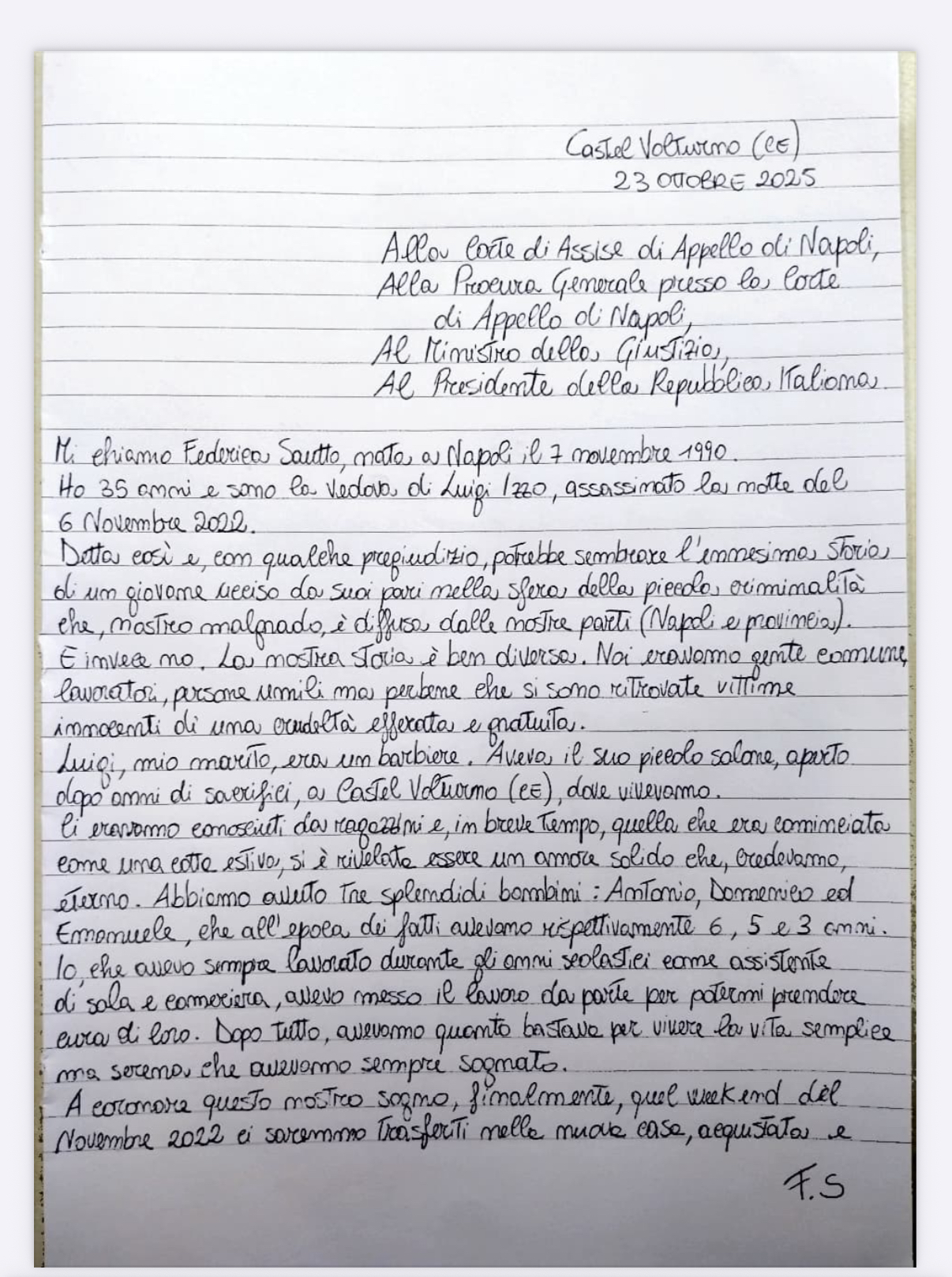 Castel Volturno (CE) 23 OTTOBRE 2025. La straziante lettera di Federica, moglie di Luigi Izzo, assassinato il 6 novembre 2022. La sua missiva, diretta alla Corte di Assise di Appello di Napoli, alla Procura Generale presso la Corte di Appello di Napoli, al Ministro della Giustizia e al Presidente della Repubblica Italiana.