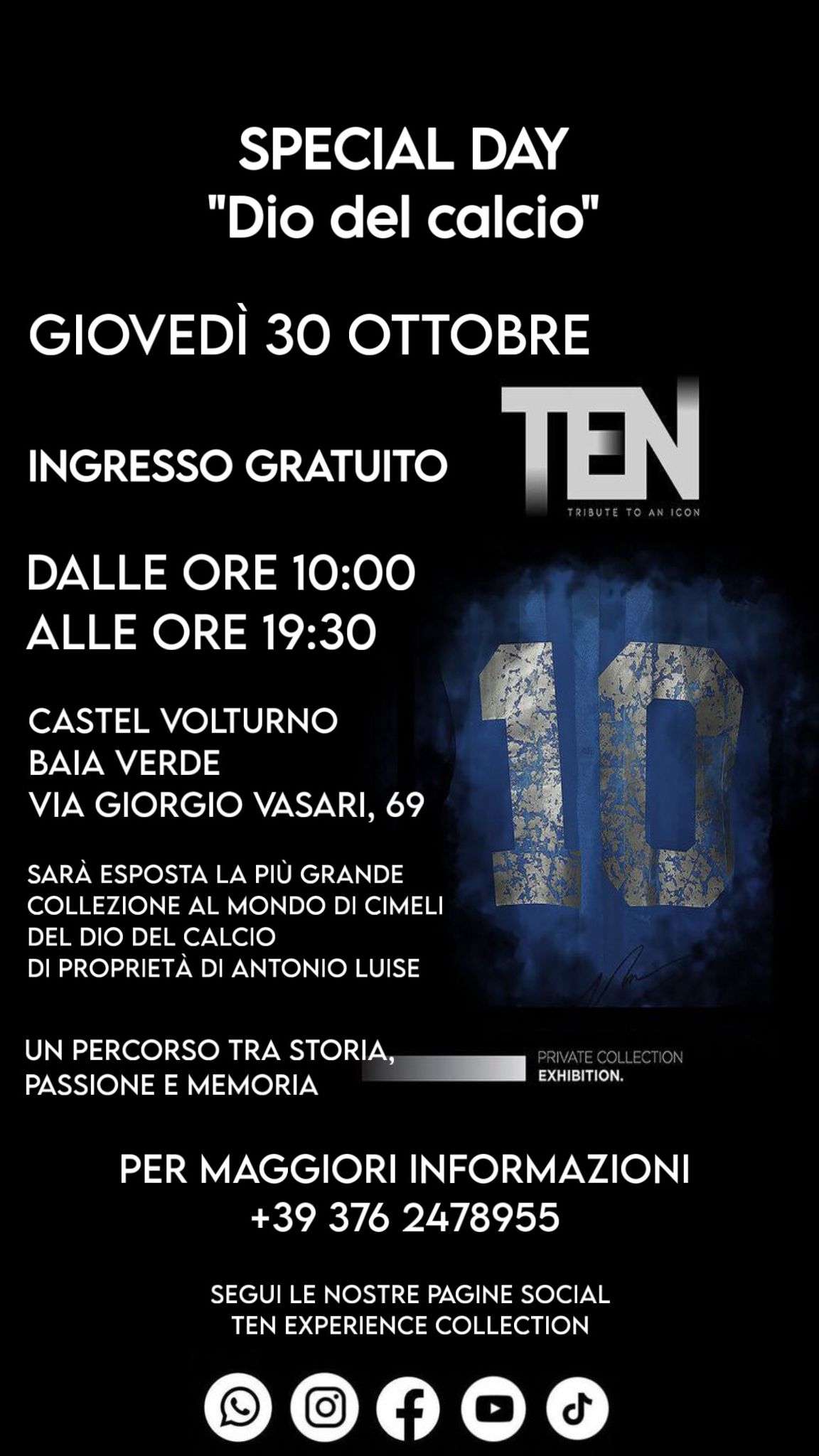 Sarà inoltre possibile ammirare una selezione esclusiva della collezione privata di cimeli di Maradona più grande al mondo, appartenente ad Antonio Luise (immobiliarista).