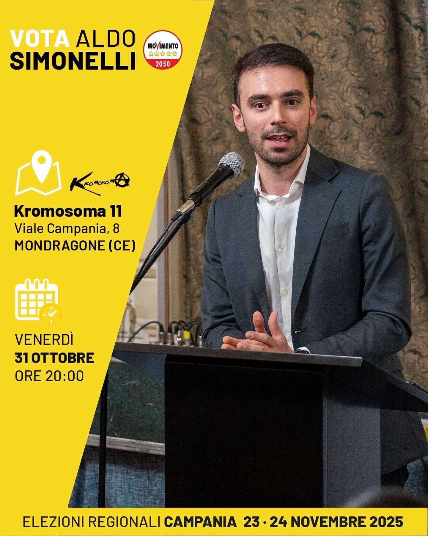 MONDRAGONE (CE) – Venerdì 31 ottobre, alle ore 20:00, presso il Kromosoma 11 di Mondragone, in viale Campania 8, il candidato del Movimento 5 Stelle alle elezioni regionali della Campania, Aldo Simonelli, incontrerà cittadini, attivisti e simpatizzanti per un momento di confronto aperto sul futuro del territorio.