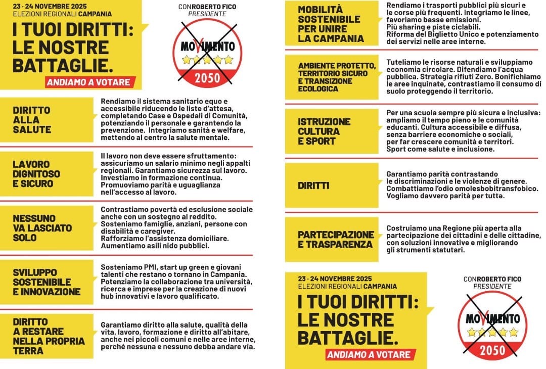 L’iniziativa apre una due giorni di incontri in diverse province, in vista delle elezioni regionali del 23 e 24 novembre 2025. Il Movimento punta a ricucire il legame con quei cittadini che negli ultimi anni si sono allontanati dalle urne, invitandoli a tornare protagonisti del cambiamento attraverso un voto consapevole.