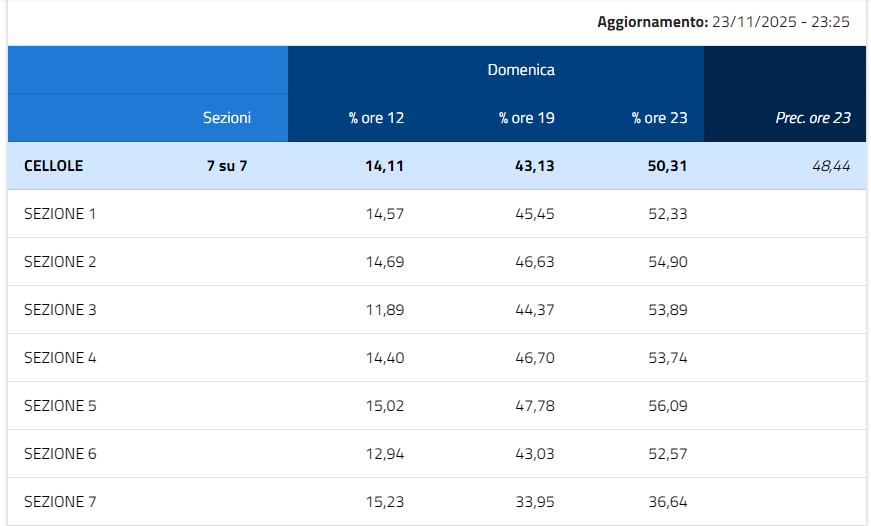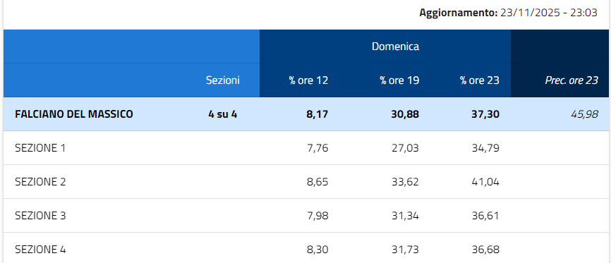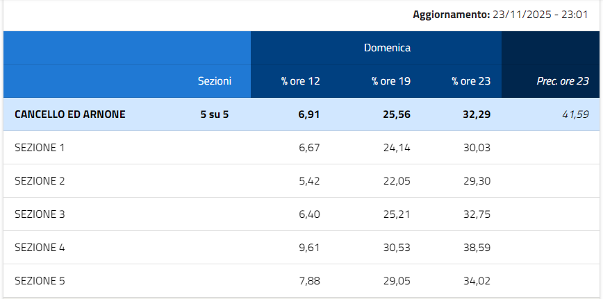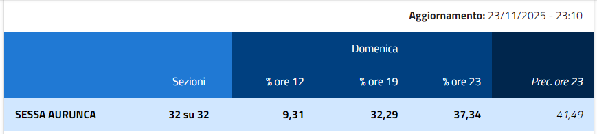Oltre a questi due Comuni, interessanti anche le percentuali di Carinola, Falciano del Massico e Cancello ed Arnone. Carinola, ieri sera alle 23:10, faceva registrare un 40,60%; Falciano del Massico, invece, alle ore 23:03, il 37,30%; Cancello ed Arnone, alle ore 23:01, il 32,29%. Sessa Aurunca, in tutte le sue 32 Sezioni, una percentuale del 37,34% alle ore 23:10.
