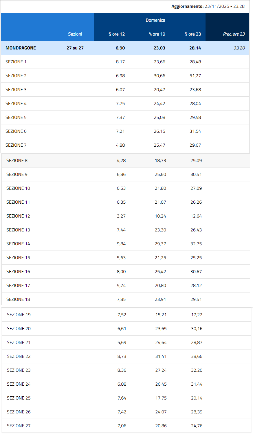 Il Comune di Mondragone, con l’ultimo aggiornamento sull’affluenza, risalente alle ore 23:28 di ieri sera, faceva registrare una percentuale, su tutte e 27 le Sezioni, del 28,14%, rispetto al 33,20% delle scorse elezioni. Ribadiamo, chiaramente, che a queste percentuali vanno aggiunte quelle di oggi, in uscita, come dicevamo, dalle 15:00 in poi.