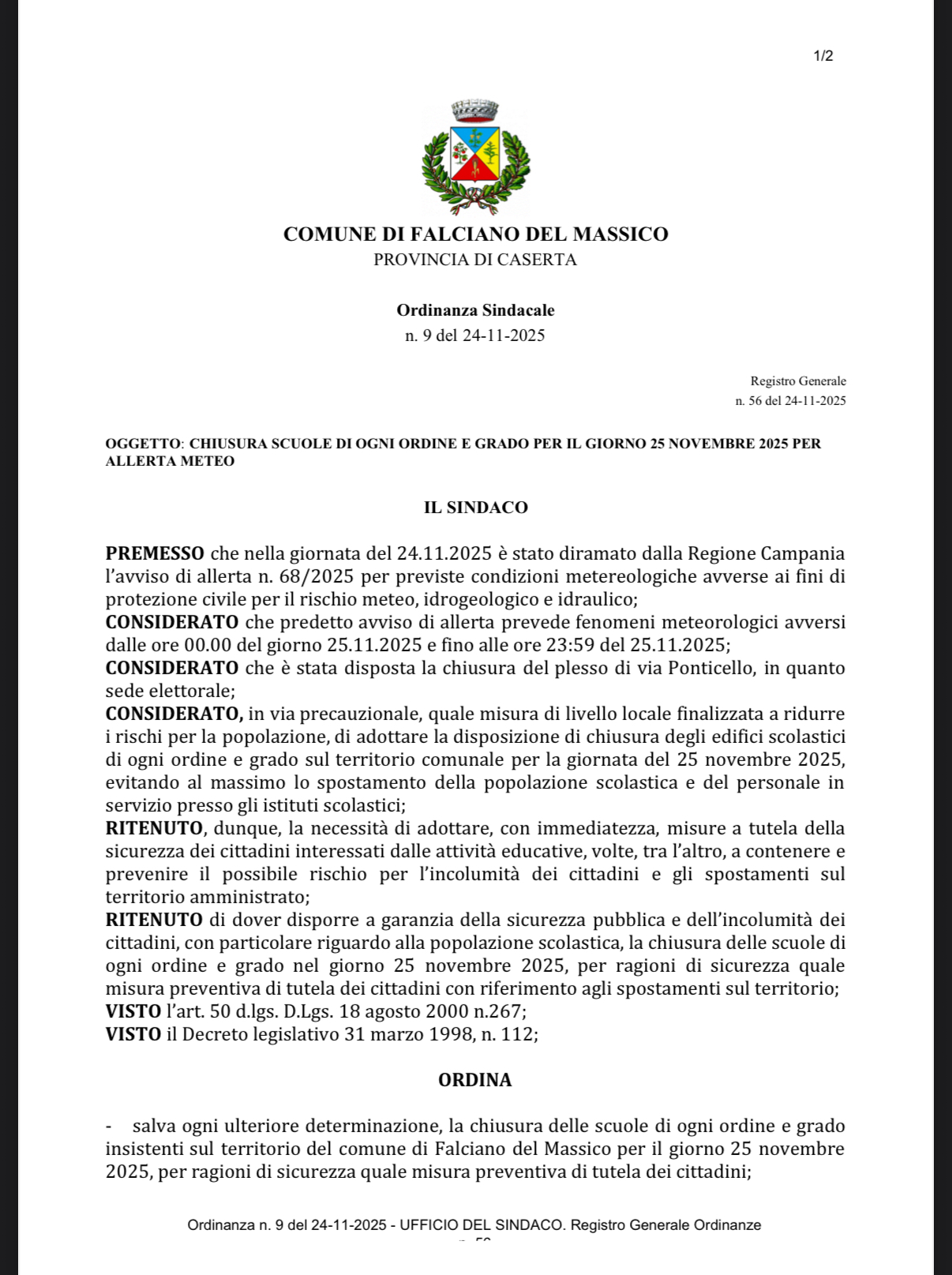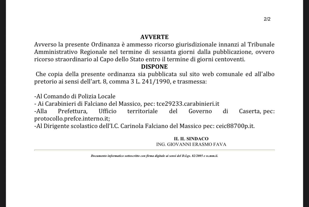 tale ragione, il sindaco di Falciano del Massico, Ing Giovanni Erasmo Fava, ha emesso ordinanza di chiusura scuole di ogni ordine e grado per il giorno di domani, 25 novembre.