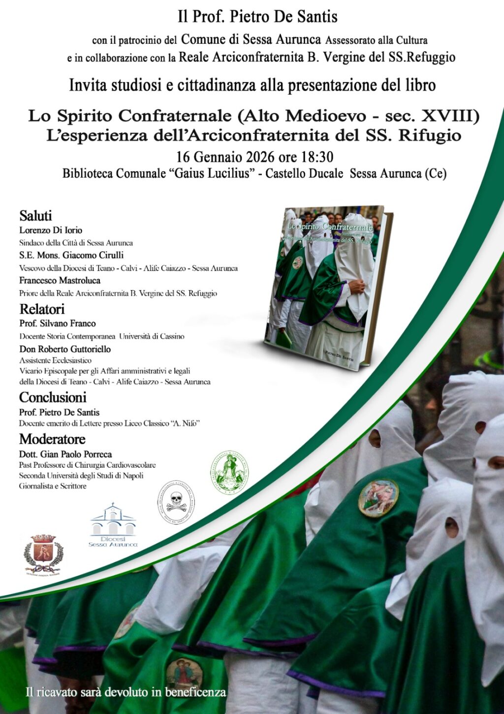 Venerdì 16 gennaio 2026, alle ore 18:30, presso la Biblioteca Comunale “Gaius Lucilius” nel Castello Ducale di Sessa Aurunca, si terrà la presentazione del volume “Lo Spirito Confraternale (Alto Medioevo sec. – XVIII). L’esperienza dell’Arciconfraternita del SS. Rifugio” del Prof. Pietro De Santis.
